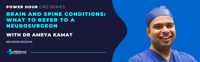 MEDirect’s Power Hour CPD series continues with Neurosurgeon, Dr Ameya Kamat, for a session on Brain And Spine Conditions: What To Refer To A Neurosurgeon.